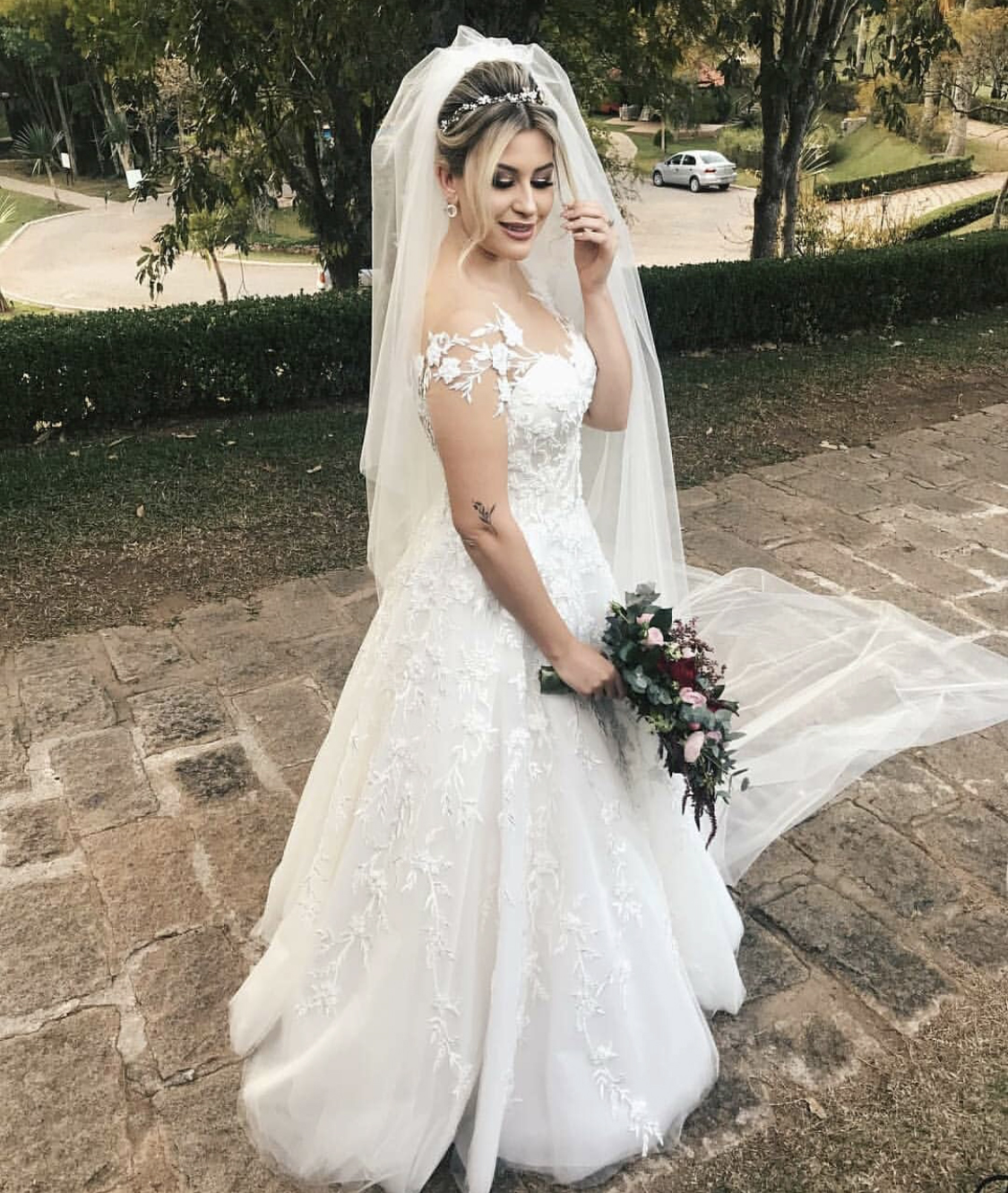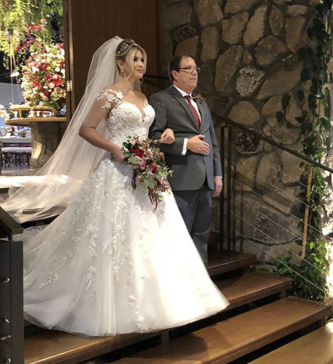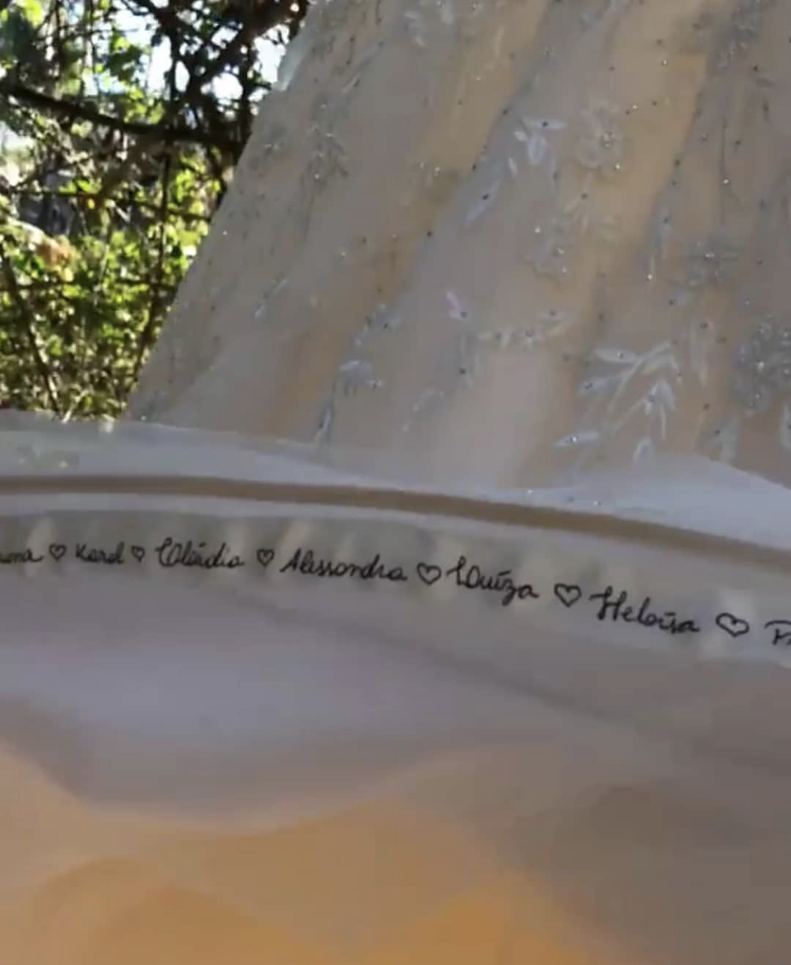 Feito pela estilista Solaine Piccoli, o vestido foi de uma verdadeira princesa. Acinturado e com muito detalhes bordados, muitas flores e brilho. Nada de cauda gigantesca, um vestido perfeito para a Niina.