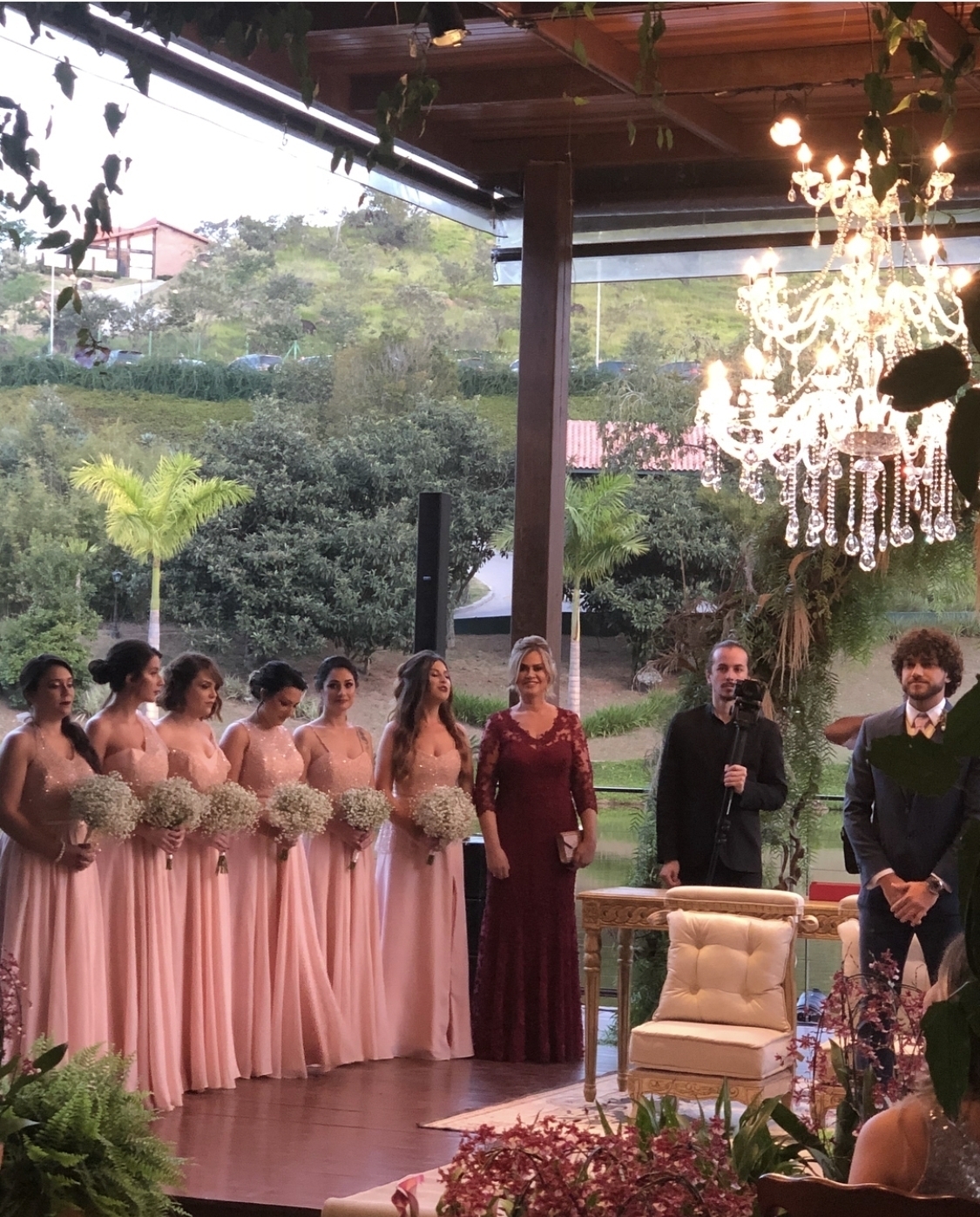 Acho que não teve um convidado que não chorou! A cerimônia começou de dia e aconteceu durante o pôr do sol. O Gui chorou muito quando a Niina entrava com seu pai. A cachorrinha Zara levou as alianças até o altar, a coisa mais linda! Lindo!