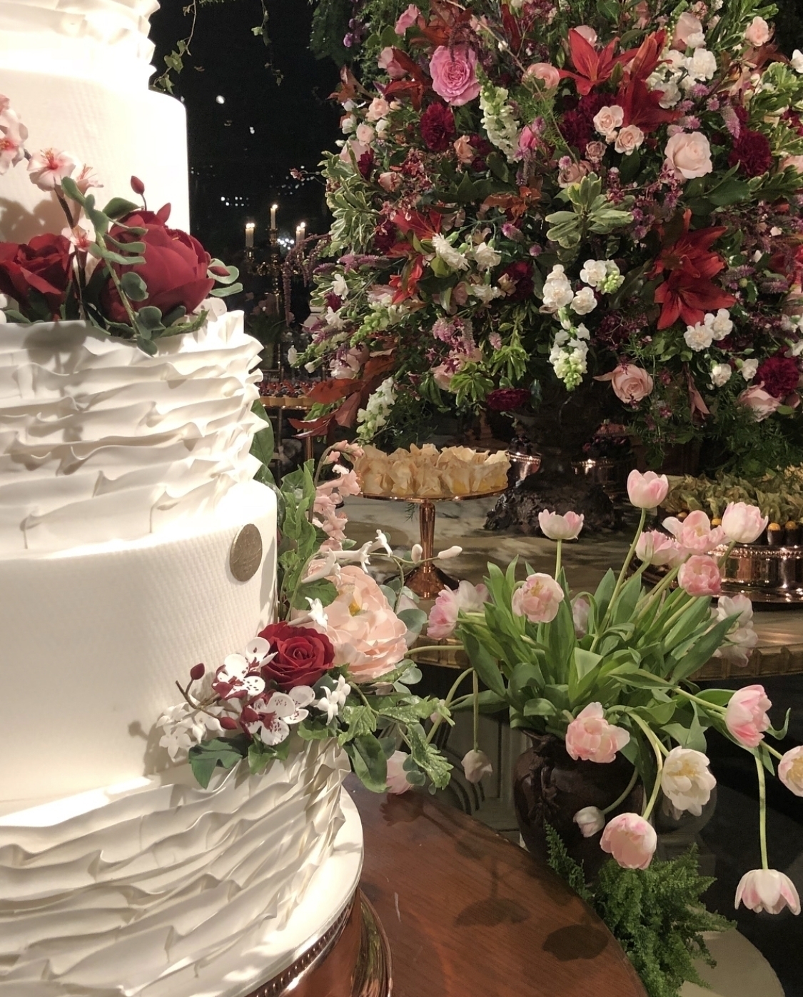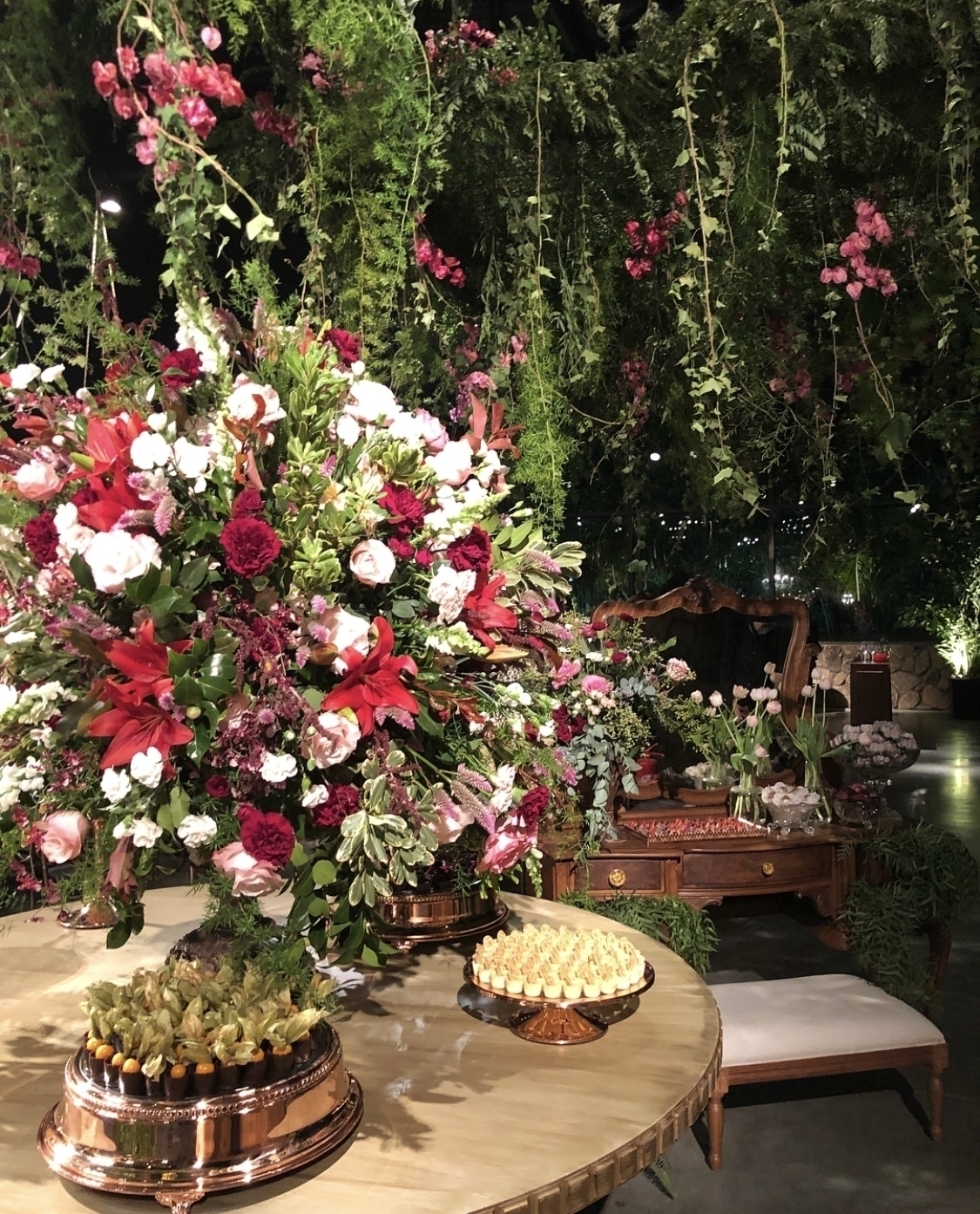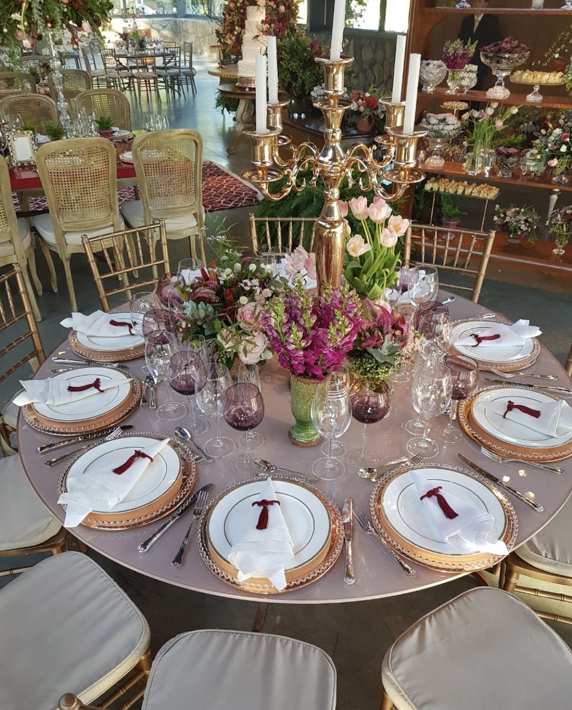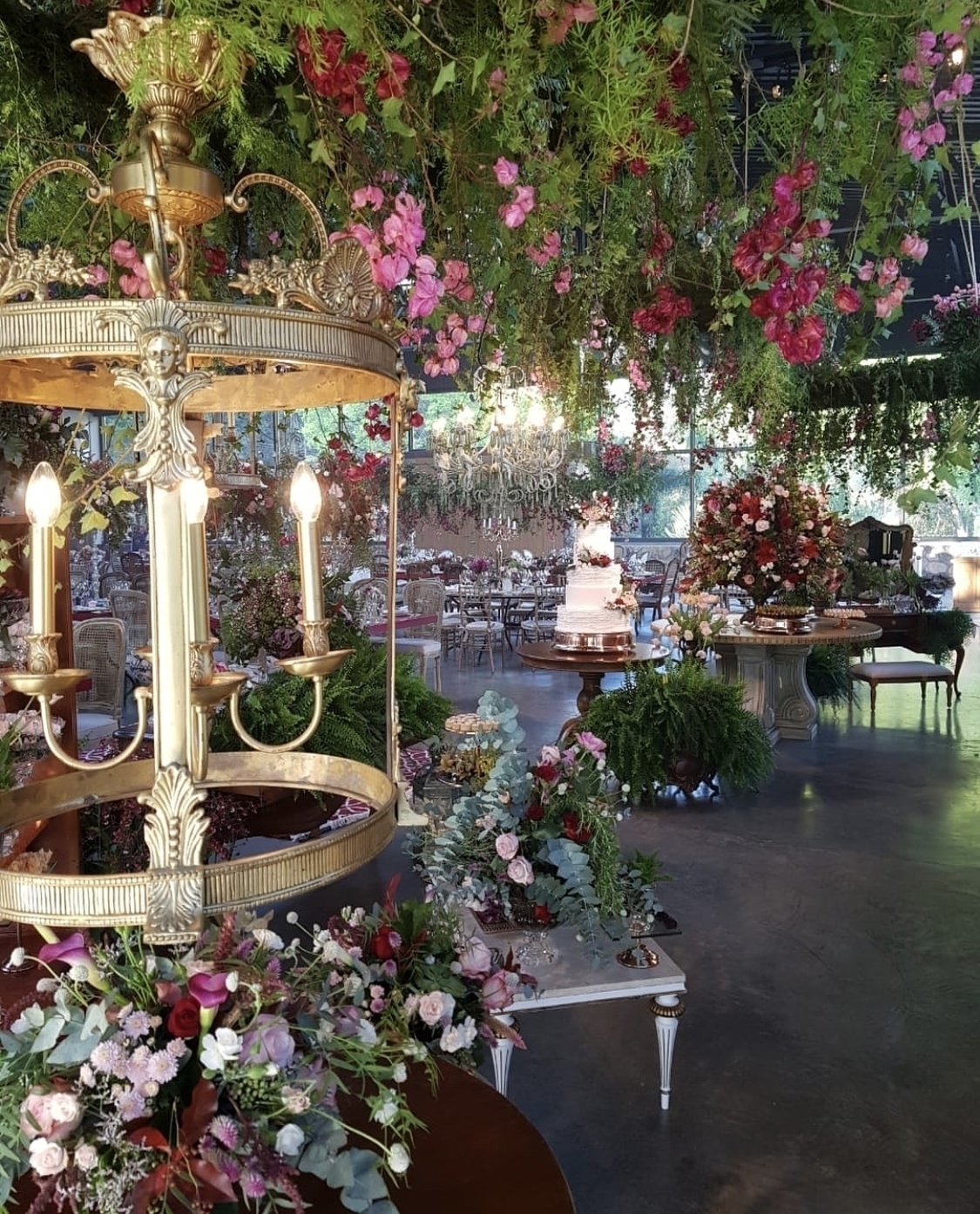 Já dava pra esperar que a Niina fosse escolher muitas flores, muitas mesmo! O salão estava todo decorado com flores em tons de rosa e branco. Flores de todos os tipos, espalhadas pelo chão e pelas mesas. A decoração foi extremamente romântica com detalhes rústicos. O dourado dominou as mesas, realçando o romantismo do casamento.