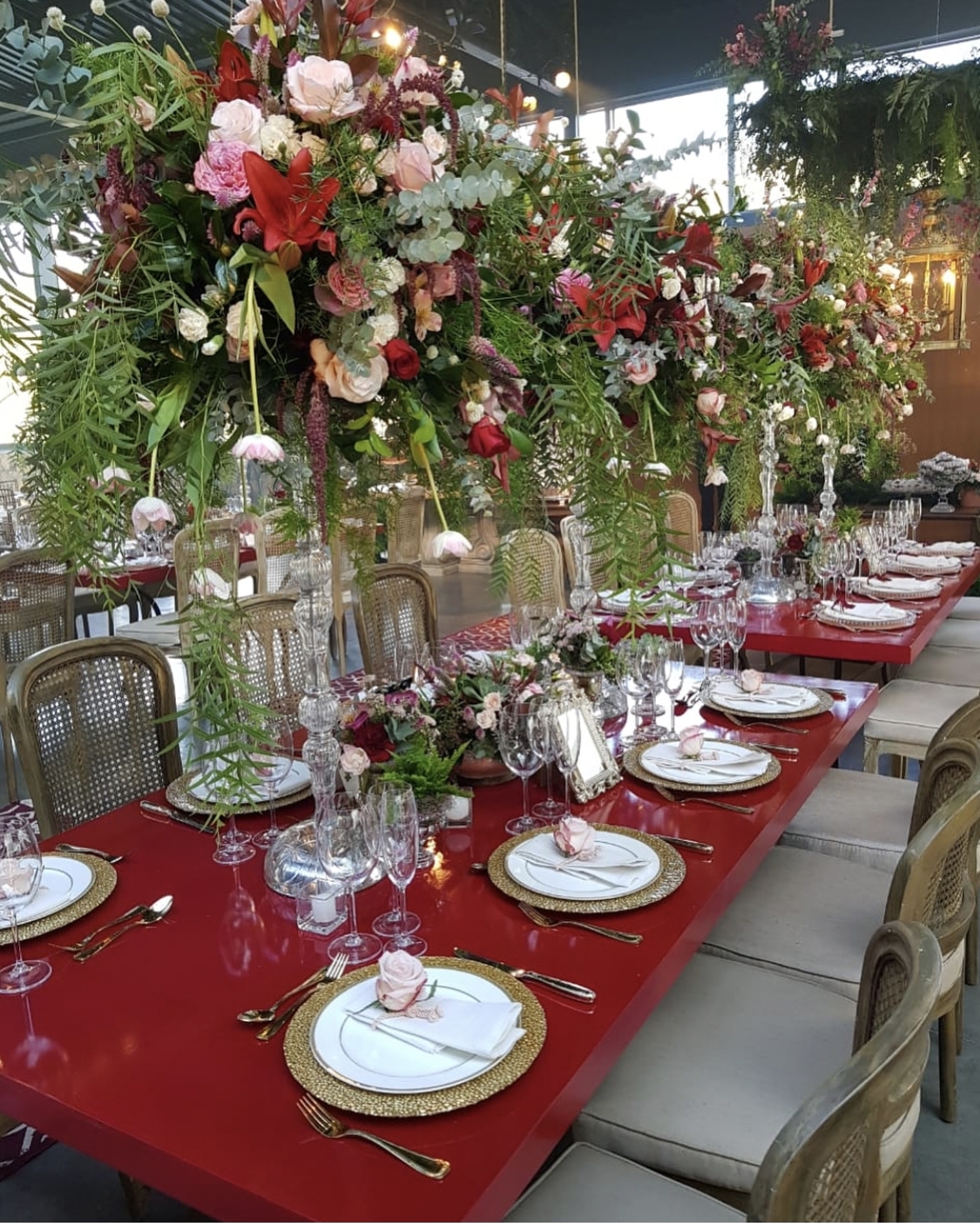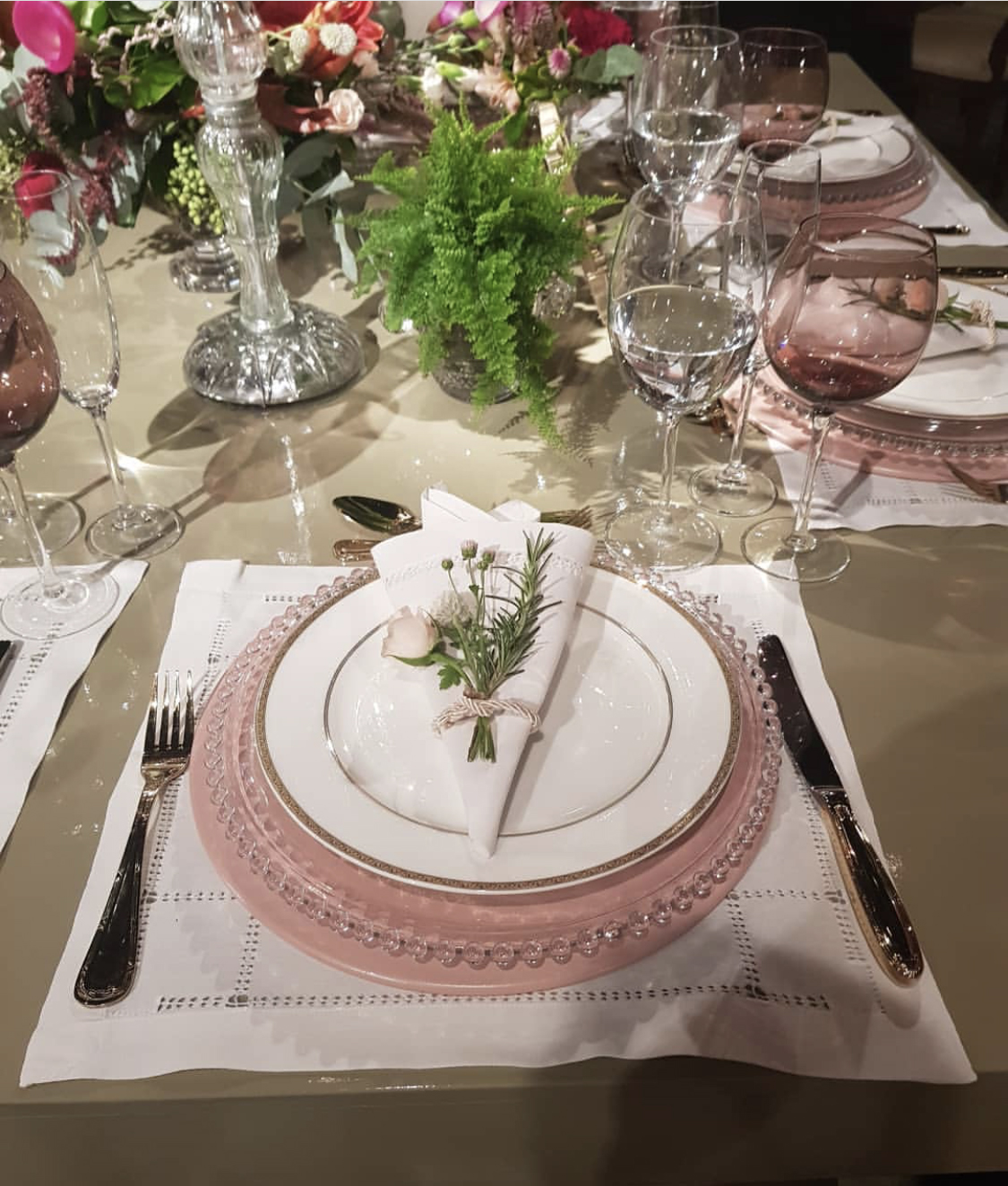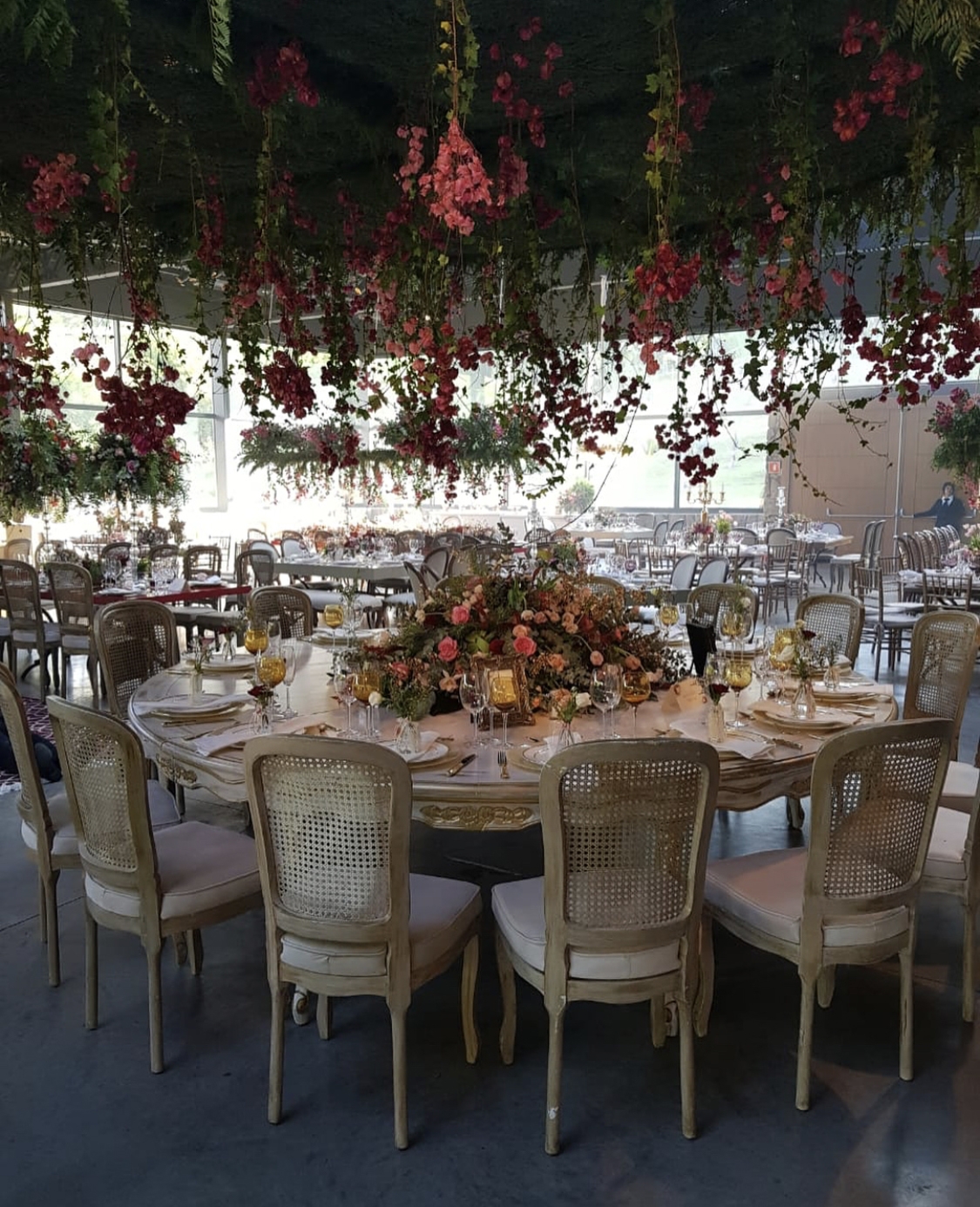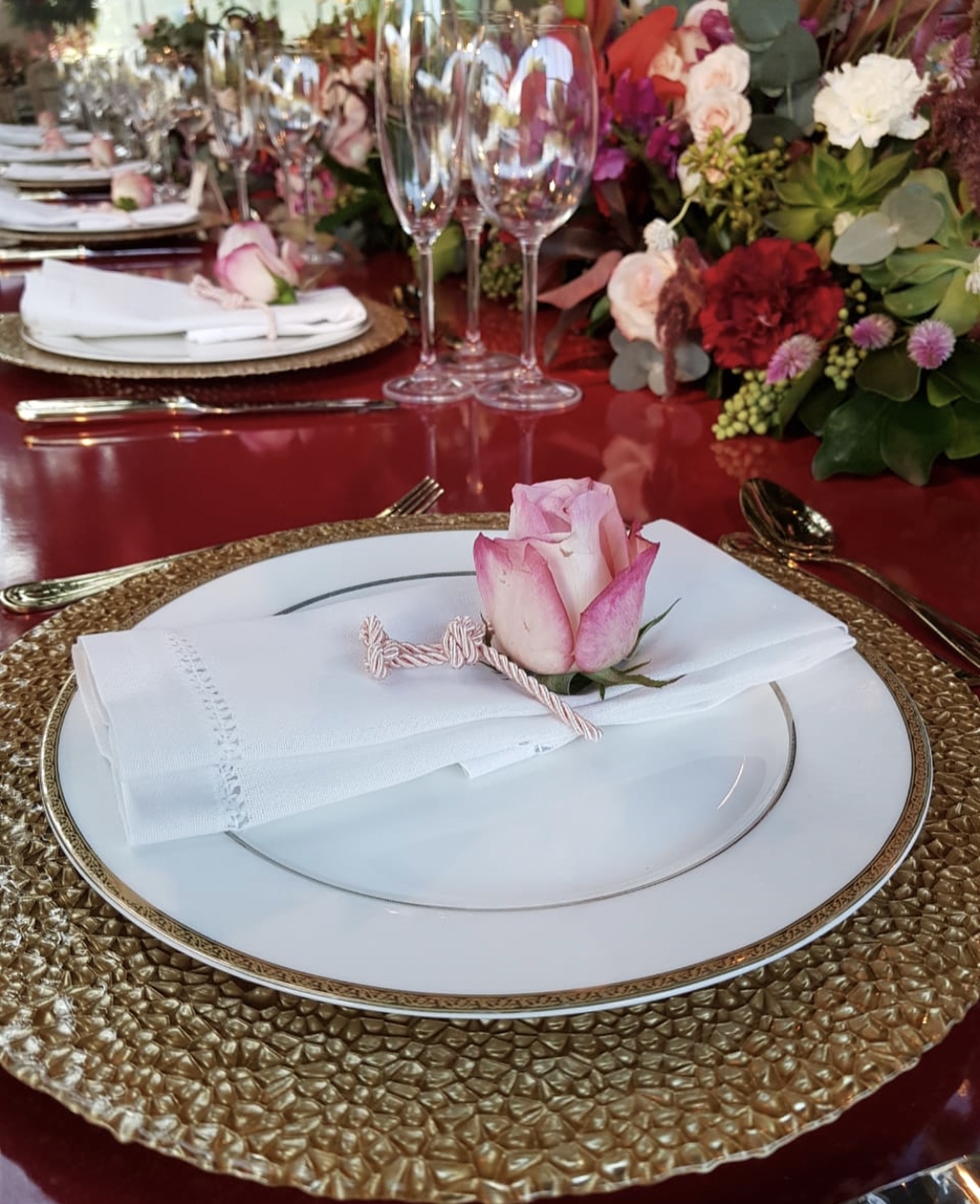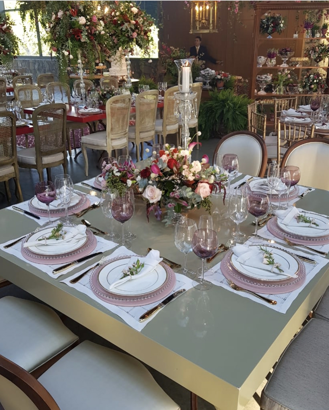 Já dava pra esperar que a Niina fosse escolher muitas flores, muitas mesmo! O salão estava todo decorado com flores em tons de rosa e branco. Flores de todos os tipos, espalhadas pelo chão e pelas mesas. A decoração foi extremamente romântica com detalhes rústicos. O dourado dominou as mesas, realçando o romantismo do casamento.