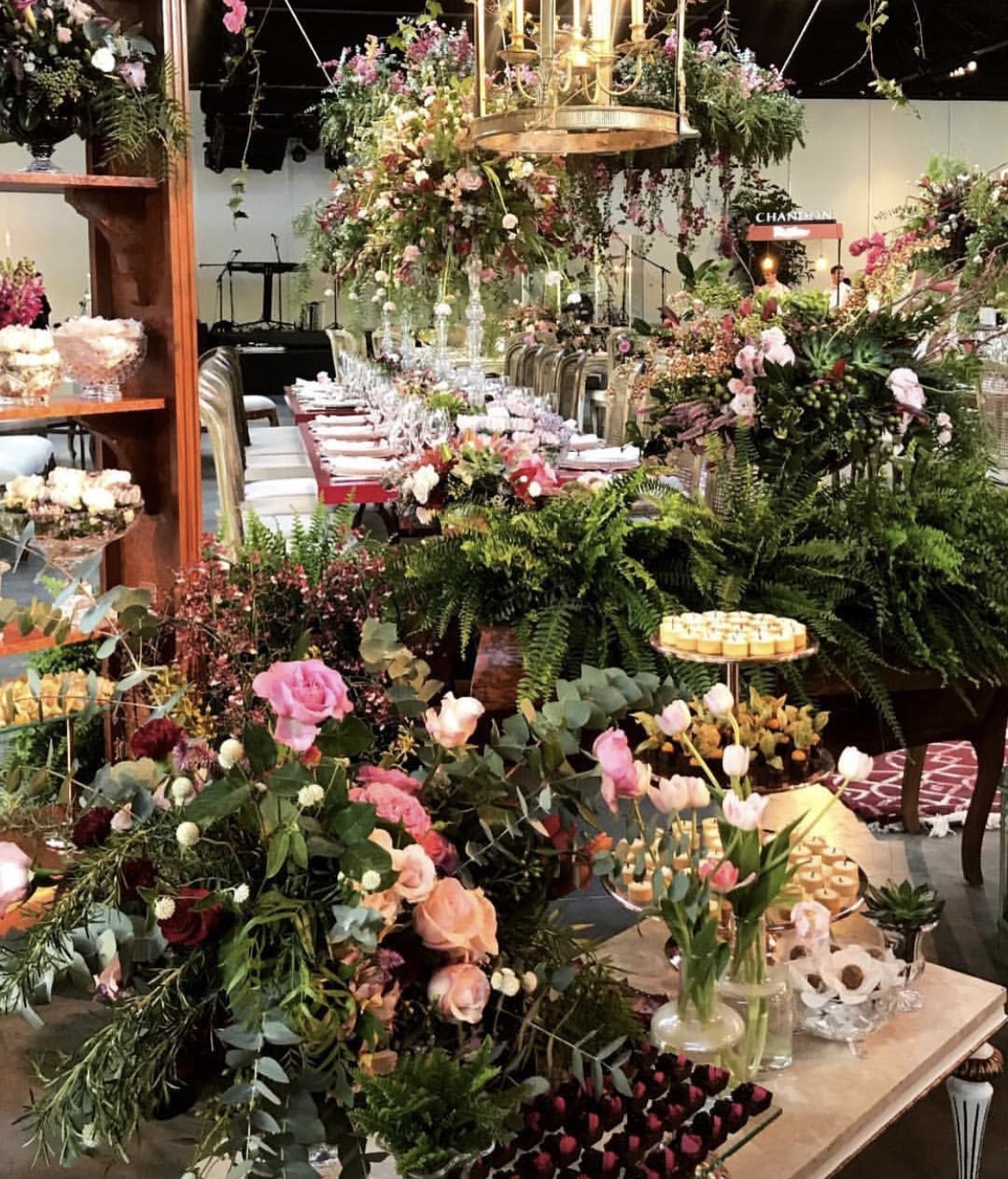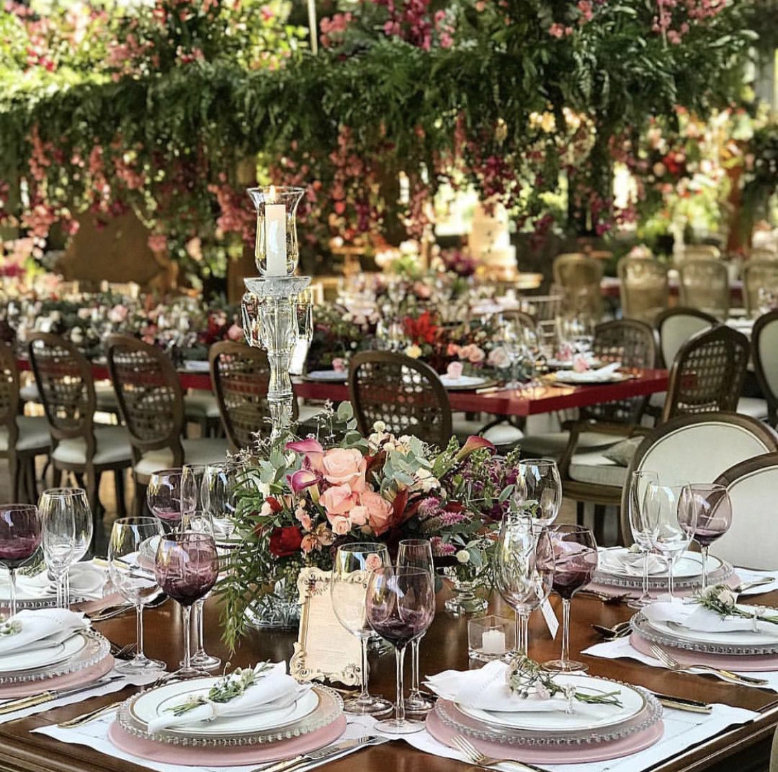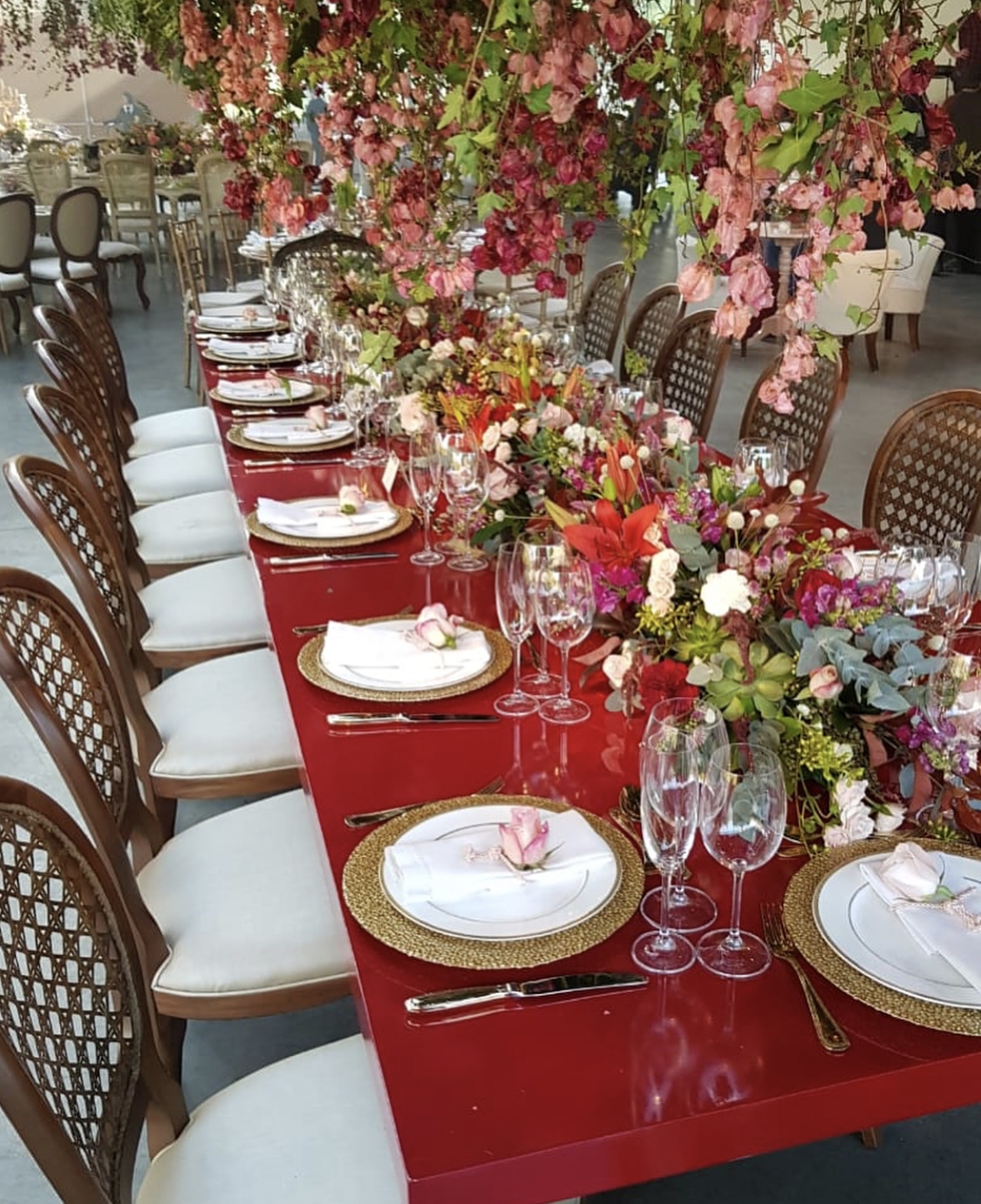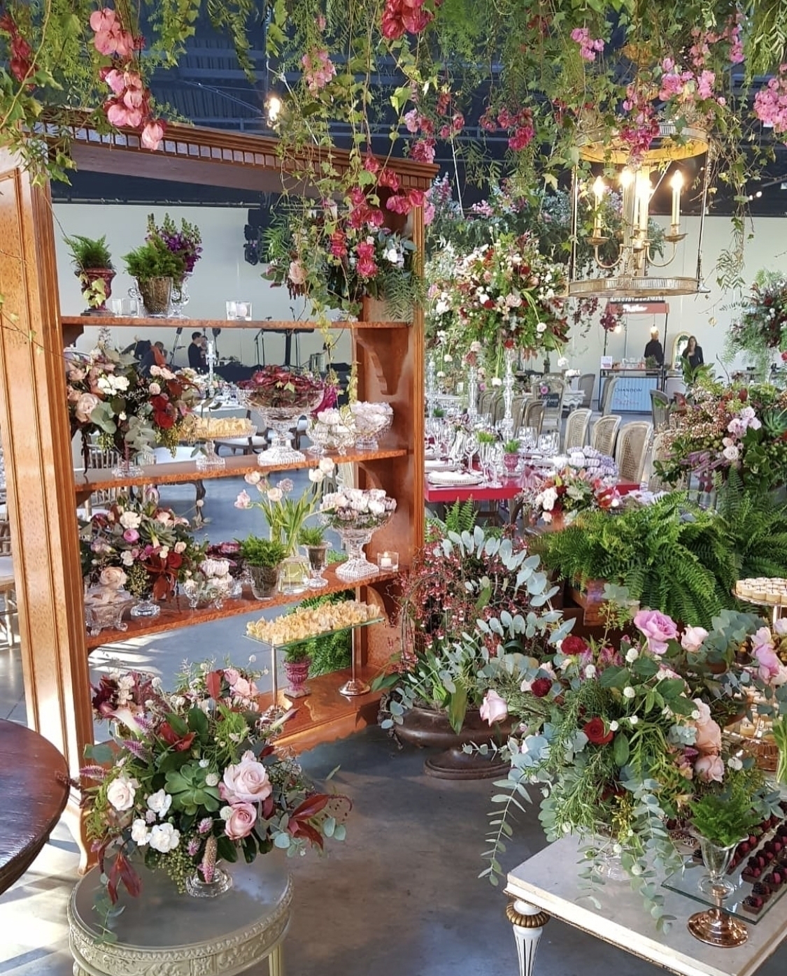 Já dava pra esperar que a Niina fosse escolher muitas flores, muitas mesmo! O salão estava todo decorado com flores em tons de rosa e branco. Flores de todos os tipos, espalhadas pelo chão e pelas mesas. A decoração foi extremamente romântica com detalhes rústicos. O dourado dominou as mesas, realçando o romantismo do casamento.